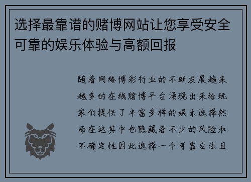 选择一个可靠的赌博网站,确保玩家能够享受安全、可靠且高回报的娱乐体验,并非一件容易的事。首先,合法性和资质的确认是选择平台的基础。其次,平台的安全性和数据保护措施决定了玩家资金和个人信息的安全性。再者,支付方式的安全性和回报率的合理性是评估平台优劣的重要标准,最后,良好的客户服务和流畅的用户体验也是提升整体体验不可忽视的因素。